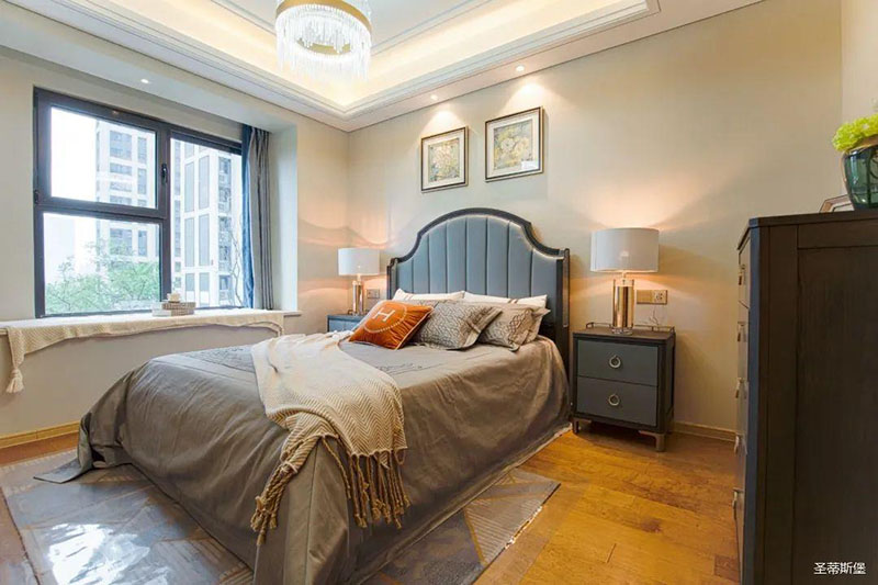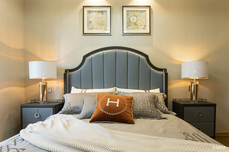 次卧高床屏由金属镶嵌,呈现简约有序的线条,雾霾蓝床屏与浅蓝朦胧装饰画,窗帘相呼应,色泽搭配和谐自然,无不透漏着一种简洁大方视觉体验。