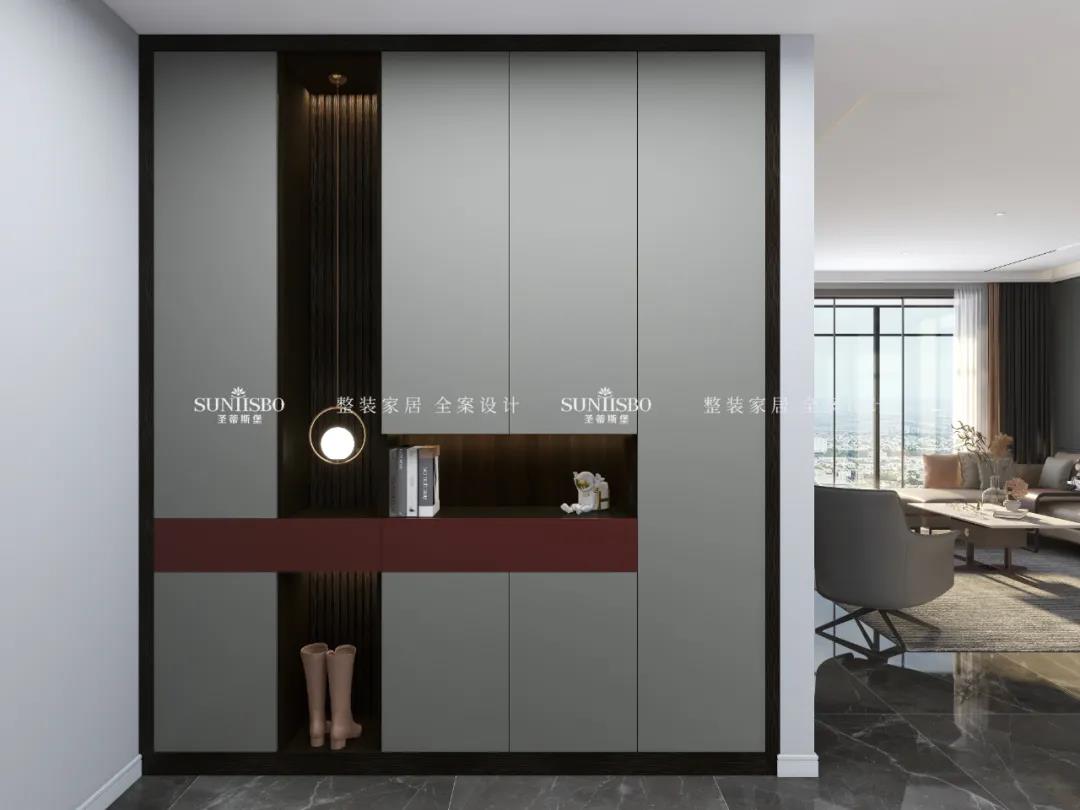 灰色平板门和烟熏色柜体做深浅搭配,搭配深灰铝框门,整体简单又大气,再点缀一抹赤红色,点亮了整个空间。
